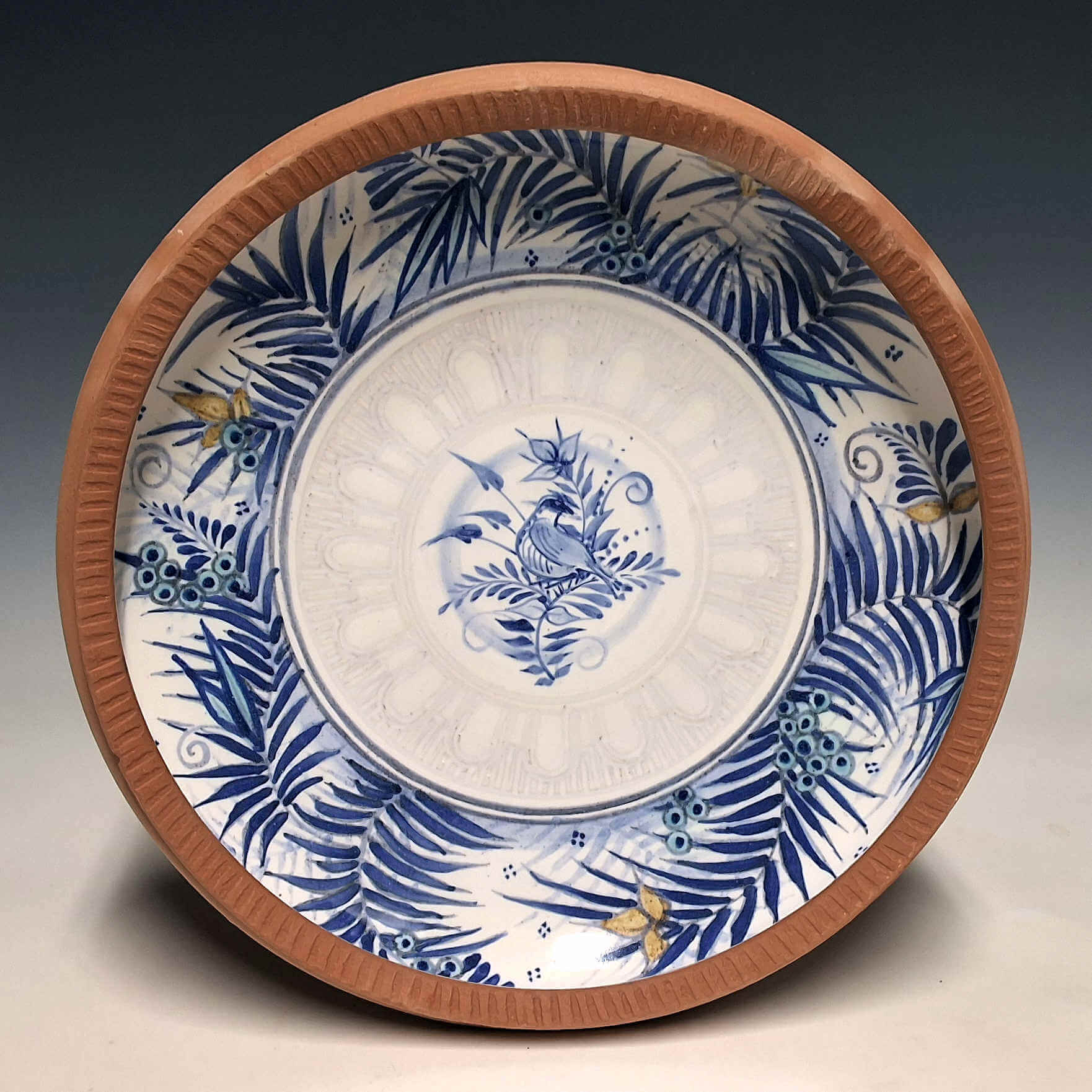 Hand thrown earthenware, slipped and sgraffito engraved, maiolica glazed, with overglaze painted decoration. 8.5″ d.
