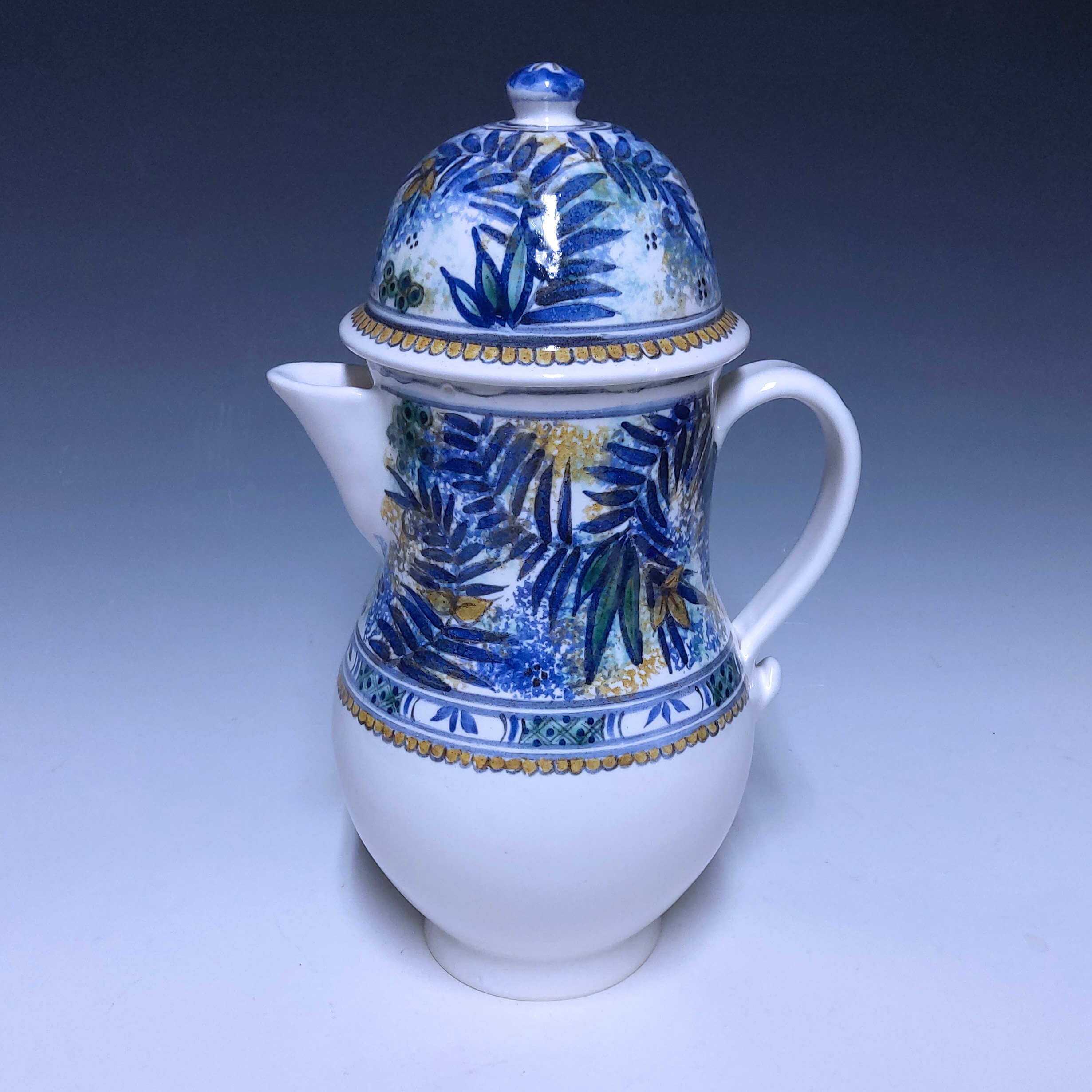 Thrown ewer with lid, decorated with sponging and hand painted design.