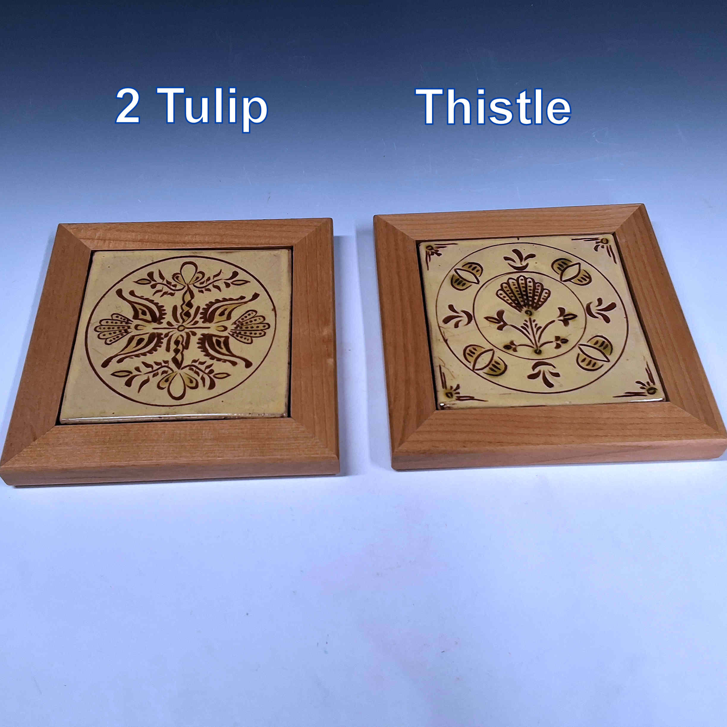 Framed and sgraffito engraved tiles. 6″ x 6″