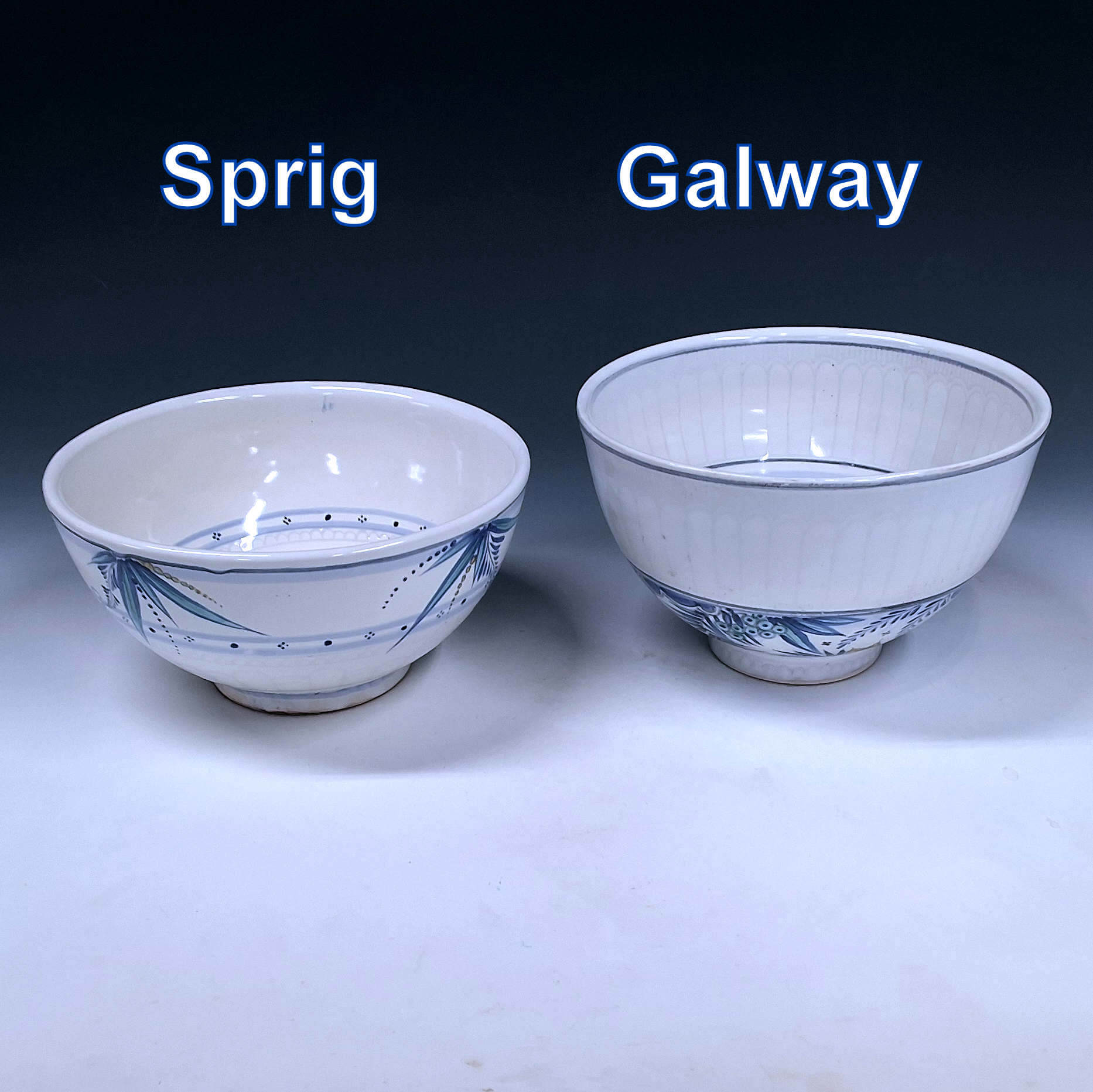 Maiolica glazed medium sized bowls with hand painting and white-on-white decoration. 8″dia.