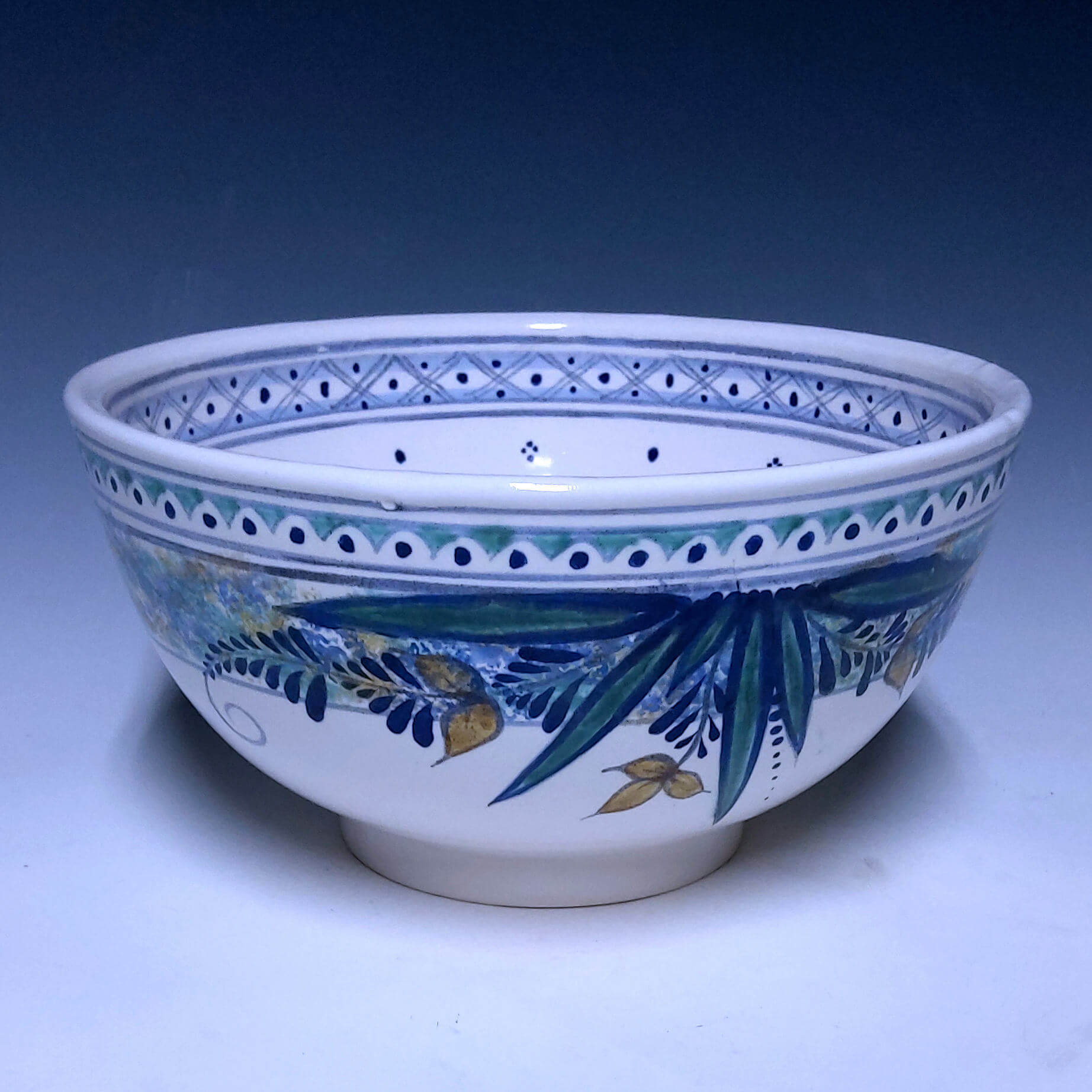 Medium delftware punch bowl with hand painted “Deerfield” design over a sponged border.