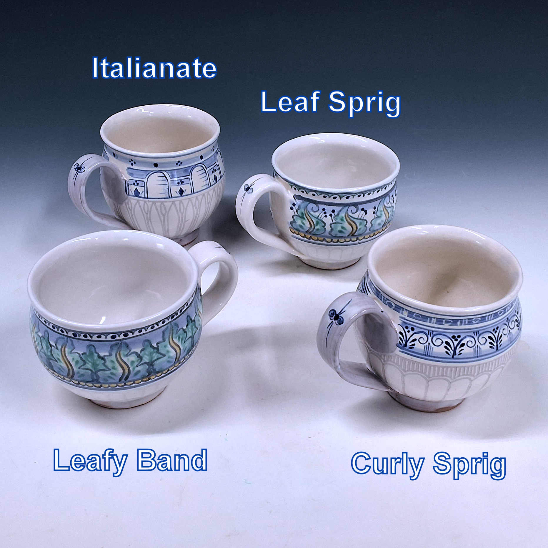 Maiolica glazed, and hand painted round mugs. 3.5″ h