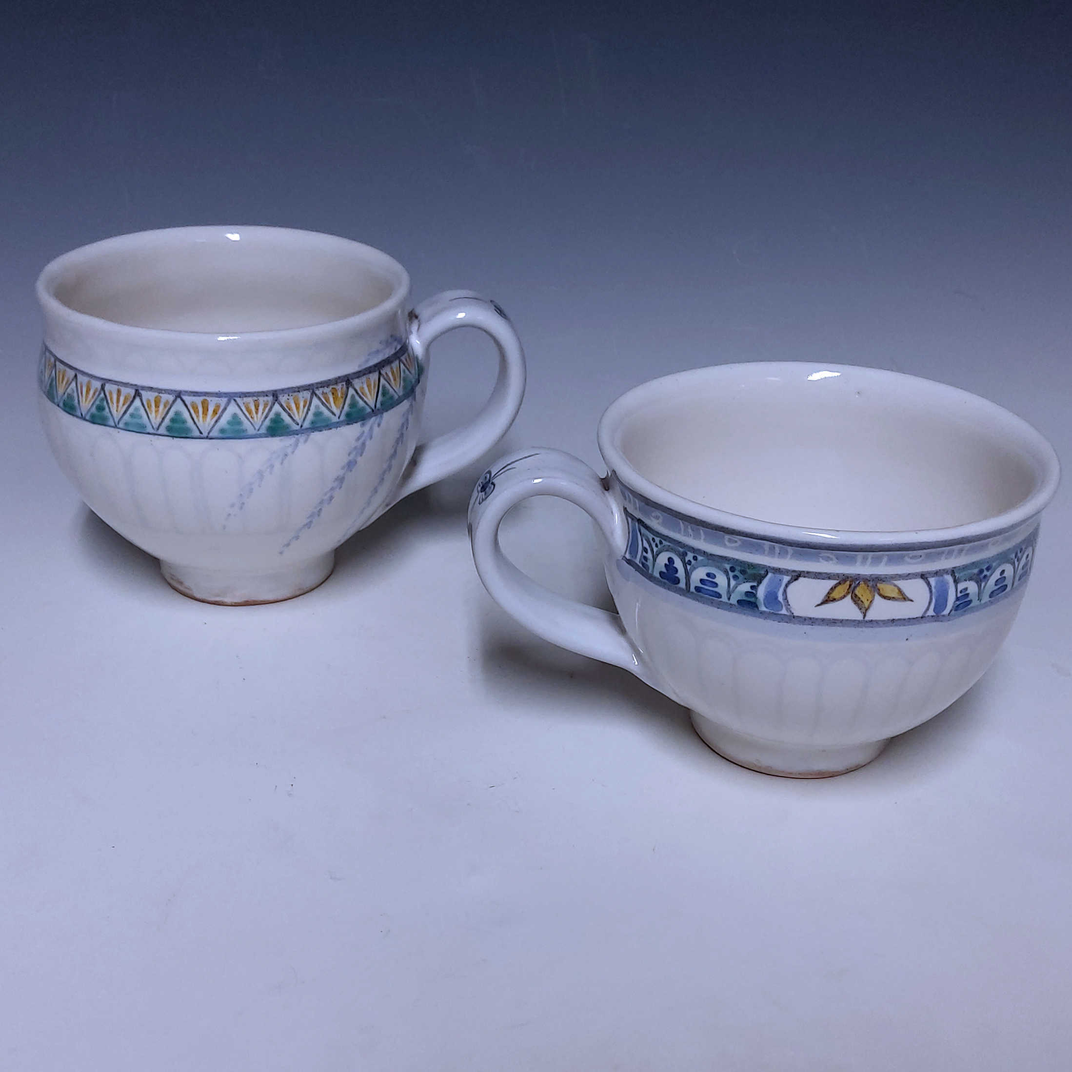 Thrown delftware mugs with engraved bianco patterns and hand painted details.