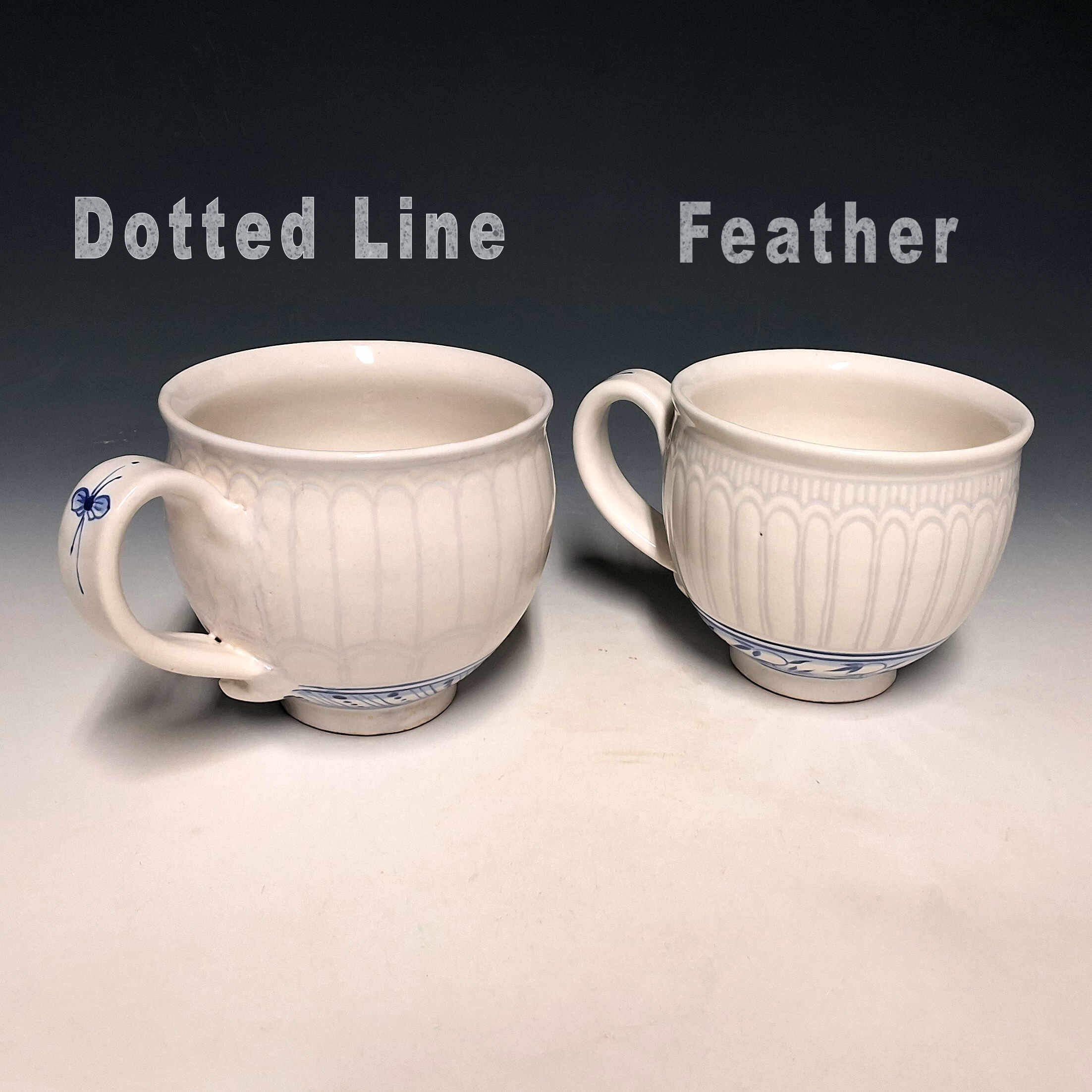 Thrown earthenware round mugs with underglaze sgraffito etching and overglaze painted decoration.